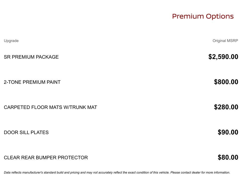 This 2025 Nissan Sentra SR in White is a great choice and features the SR Premium Package, which includes over-the-air (OTA) updating for headunit firmware via a Wi-Fi WPA2 connection, a Bose Premium Audio System with 8 Speakers, a 6-Way Power Driver's Seat, 2-way power lumbar, NissanConnect Services, a Power Sliding Glass Moonroof with Tilt Feature, a Leather Heated Steering Wheel, an Intelligent Around View Monitor (I-AVM), and a Wi-Fi Hotspot. Additionally, it boasts a 2-Tone Premium Paint, Carpeted Floor Mats with Trunk Mat, and Door Sill Plates.
