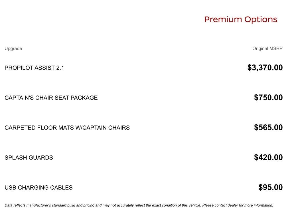 Captain's Chair Seat Package (2nd Row Center Console with Two Cupholders, 2nd Row Outboard Captain's Chairs with Armrests, and EZ Flex Second Row Seating System with One Touch Release), ProPILOT Assist 2.1 (3D Around View Monitor, Ambient Lighting with Multicolor Illumination, and Heads-Up Display), 4WD, 12 Speakers, 3rd row seats: split-bench, 4-Wheel Disc Brakes, ABS brakes, Air Conditioning, Alloy wheels, AM/FM radio: SiriusXM w/360L, Anti-whiplash front head restraints, Apple CarPlay/Android Auto, Auto High-beam Headlights, Auto tilt-away steering wheel, Auto-dimming door mirrors, Auto-dimming Rear-View mirror, Auto-leveling suspension, Automatic temperature control, Brake assist, Bumpers: body-color, Carpeted Floor Mats with Captain Chairs, Center Front Spoiler, Compass, Delay-off headlights, Driver door bin, Driver vanity mirror, Dual front impact airbags, Dual front side impact airbags, Electronic Stability Control, Emergency communication system: NissanConnect Services, Four wheel independent suspension, Front anti-roll bar, Front Bucket Seats, Front Center Armrest, Front dual zone A/C, Front reading lights, Fully automatic headlights, Garage door transmitter: myQ Connected Garage, Genuine wood dashboard insert, Heated door mirrors, Heated Front Bucket Seats, Heated front seats, Heated steering wheel, HVAC memory, Illuminated entry, Knee airbag, Leather steering wheel, Low tire pressure warning, Memory seat, Navigation system: Google Maps, Occupant sensing airbag, Outside temperature display, Overhead airbag, Overhead console, Panic alarm, Passenger door bin, Passenger vanity mirror, Power door mirrors, Power driver seat, Power Liftgate, Power passenger seat, Power steering, Power windows, Radio: NissanConnect with SiriusXM 360L, Rain sensing wipers, Rear air conditioning, Rear anti-roll bar, Rear reading lights, Rear seat center armrest, Rear window defroster, Rear window wiper, Reclining 3rd row seat, Remote keyless entry, Security system, Speed control, Speed-sensing steering, Speed-Sensitive Wipers, Splash Guards, Split folding rear seat, Spoiler, Steering wheel memory, Steering wheel mounted audio controls, Tachometer, TailorFit Seat Trim, Telescoping steering wheel, Tilt steering wheel, Traction control, Trip computer, Turn signal indicator mirrors, USB Charging Cables, Variably intermittent wipers, Voltmeter, and Wheels: 20 x 8.5J Machined and Painted Alloy.