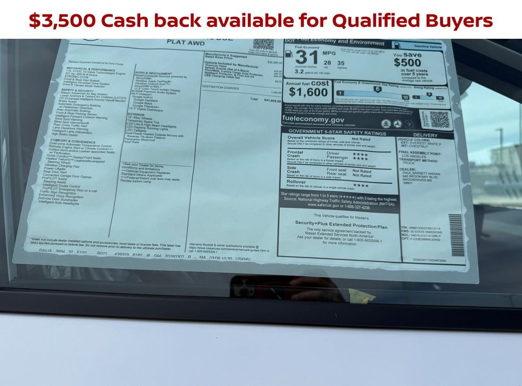 AWD, 10 Speakers, 4-Wheel Disc Brakes, ABS brakes, Air Conditioning, Alloy wheels, AM/FM radio: SiriusXM w/360L, Auto High-beam Headlights, Auto-dimming Rear-View mirror, Automatic temperature control, Black Splash Guards (set of 4), Bose Premium Audio System, Brake assist, Bumpers: body-color, Delay-off headlights, Driver door bin, Driver vanity mirror, Dual front impact airbags, Dual front side impact airbags, Electronic Stability Control, Emergency communication system: NissanConnect Services, First Aid Kit, Floor Mats with 2-Piece Cargo Area Protector, Four wheel independent suspension, Front anti-roll bar, Front Bucket Seats, Front Center Armrest, Front dual zone A/C, Front reading lights, Fully automatic headlights, Garage door transmitter: myQ Connected Garage, Heated door mirrors, Heated Front Bucket Seats, Heated front seats, Heated steering wheel, Illuminated entry, Knee airbag, Low tire pressure warning, Memory seat, Navigation system: Google Maps, Occupant sensing airbag, Outside temperature display, Overhead airbag, Overhead console, Panic alarm, Passenger door bin, Passenger vanity mirror, Power door mirrors, Power driver seat, Power Liftgate, Power moonroof, Power passenger seat, Power steering, Power windows, Premium Paint, Quilted Semi-Aniline Leather-Appointed Seat Trim, Radio data system, Radio: AM/FM NissanConnect with Navigation, Rear anti-roll bar, Rear reading lights, Rear seat center armrest, Rear side impact airbag, Rear window defroster, Rear window wiper, Remote keyless entry, Security system, Speed control, Speed-sensing steering, Speed-Sensitive Wipers, Split folding rear seat, Spoiler, Steering wheel mounted audio controls, Tachometer, Telescoping steering wheel, Tilt steering wheel, Traction control, Trip computer, Turn signal indicator mirrors, USB Charging Cable Set, Variably intermittent wipers, Wheels: 19 Unique Dark Painted Aluminum Alloy, and Wireless Apple CarPlay/Wireless Android Auto. Price includes: $3500 - Nissan Customer Cash. Exp. 05/04/2026